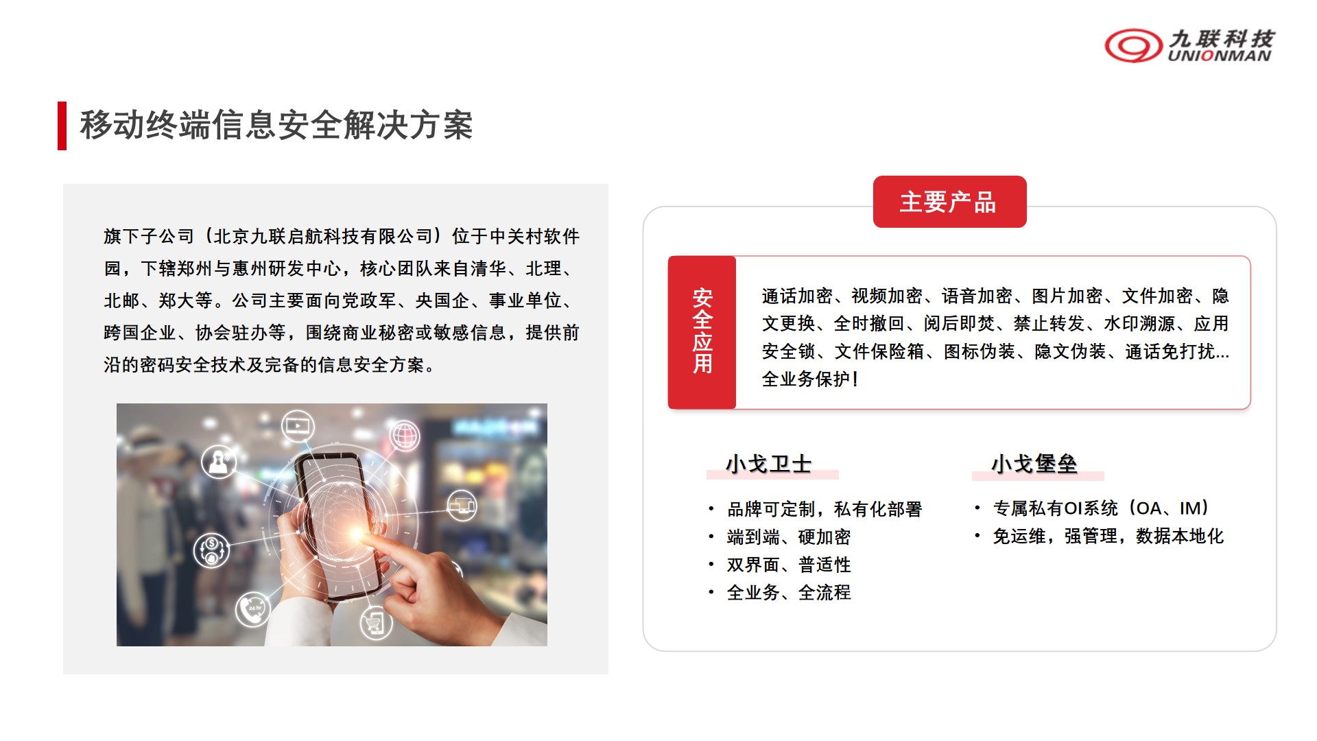 旗下子公司(北京HB火博启航科技有限公司)位于中关村软件园,下辖郑州与惠州研发中心,核心团队来自清华、北理、北邮、郑大等。公司主要面向党政军、央国企、事业单位、跨国企业、协会驻办等,围绕商业秘密或敏感信息,提供前沿的密码安全技术及完备的信息安全方案。